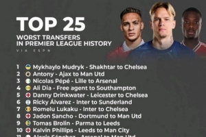 ESPN评英超历史最糟糕25笔转会:穆德里克、安东尼前二,桑乔在列